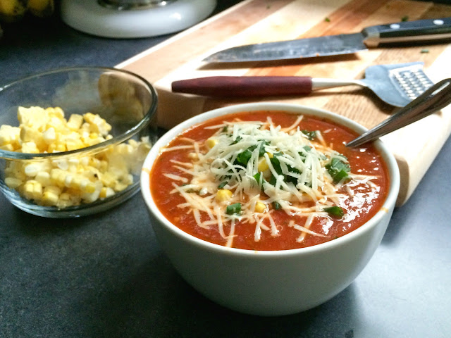 The day started out chilly and damp yesterday. The perfect kind of day to curl up with a good book and a cup of coffee. Because I was cold all morning, a big bowl of warm soup sounded like the perfect lunch. Happily I had some frozen homemade marinara sauce in the freezer, the quickest and easiest way to throw together a delicious tomato soup. I thawed some of it out, added some water and let it bubble away on the stove until nice and hot. For some additional flavor I added in a scoop of basil pesto for freshness and a couple of dashes of smoked paprika for a little smokey flavor. I topped it all off with some grilled and charred sweet corn, thinly sliced green onion, and some nice, sharp aged cheddar cheese. It was the perfect lunch to warm up to on this chilly June Saturday.